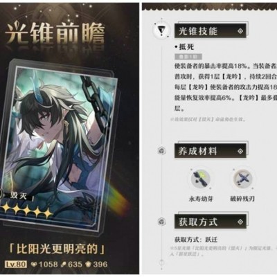 专属光锥黎明恰如此燃烧是白厄的毕业光椎,提供基础速度加成,直接优化变身后的行动效率,而无视防御与终结技后增伤的效果,完美覆盖白厄的爆发,玩家实测表明,白厄的专属专锥对比下位替代的光椎,伤害提升超高百分之30,如果有1魂,伤害更佳。