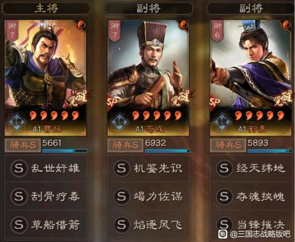 这套阵容特点就是攻防一体,并且强度极高,在目前版本里面算是比较顶级的队伍,因此可以考虑一下这样子搭配,阵容稳定性非常高,但是很依赖sp郭嘉这个武将的输出,毕竟sp郭嘉只要是主动或者突击战法触发,那么就可以造成输出伤害,因此稳定性是非常高的存在,搭配曹操全智力的增伤,那么输出伤害相当变态。