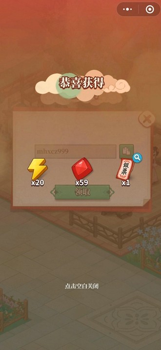 第二个:mhxcz999 体力×20 钻石×59 银票×1