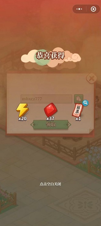第一个:mhxcz777 体力×20 钻石×37 银票×1