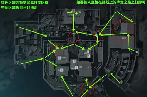 宿舍楼:三个路线开局看西大和中控拿信息,小心西大闪击或者中控闪击,后续进入核心区可以选择刷员一或者过中控进核心区。