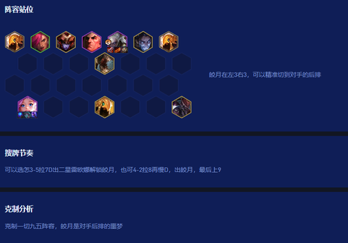 下面是给大家去分享的目前赛季初期比较强势的一套皎月阵容玩法,这套阵容整体下来还是比较考验玩家运营过渡的功底的,大家在游戏内也是可以多多去尝试学习一下阵容的运营和过渡思路来提高我们的阵容胜率的喔。