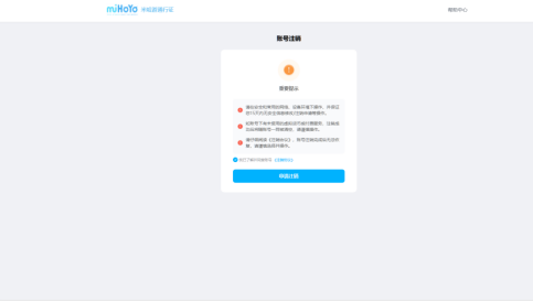 需要在这里提醒玩家的是,注销米哈游账号意味着,该账号下的全部米哈游的游戏角色都被注销删除(账号下的除了原神以外的包括,星穹铁道,绝区零,崩坏三等游戏数据都会被删除)。大家在注销账号之前一定要再三确认,这个账号下没有自己想保留的角色账户信息。(一旦注销就无法找回)。