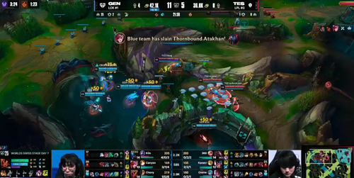 这些失误反映出TES在逆风局中的急躁,以及肉眼可见的没有沟通,TES在资源团战中的配合中屡战屡败,小龙刷新时的站位失误,被GEN抓住机会拉开经济差。整体上,TES的莽夫式进攻在面对严谨的LCK战队就很难打出头了。
